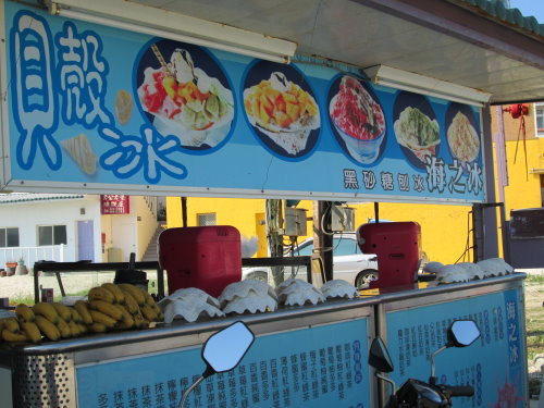 話說因為有了一個下午的時間逛吉貝,雖然剛才吃飽了,但沒找個東西來吃吃我就不叫沙拉公主了,於是我們兜了吉貝島3圈後,決定吃這間招牌華麗的冰店-貝殼冰,其實他斜對面也有一間,不過我看冰店旁種了很多天人菊,所以想做在這觀賞一下,就選他啦!