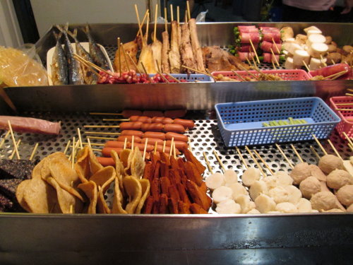 一靠近我突然想到,天氣這麼熱,這些生食被放在這吃了會不會有問題(因為我們家附近的10元燒烤都有放在冰櫃裡),但又上前了不好意思,於是買了50元