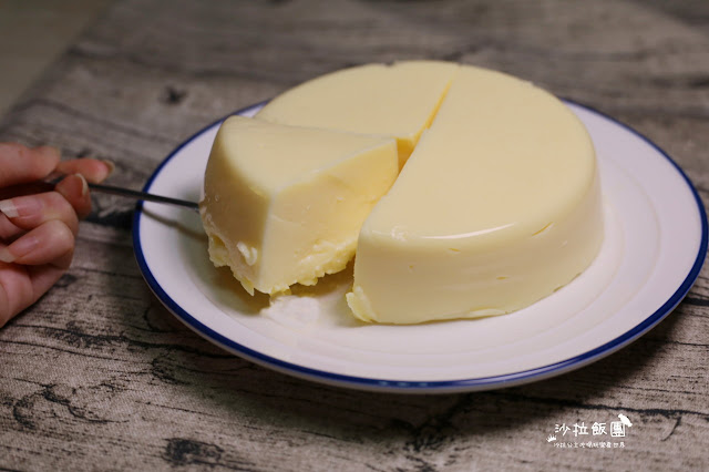 再放涼的過程中可以看到,邊緣已經有點微微的脫離容器,所以冷藏5小時後,他一倒扣就掉出來了,也可以用刮刀邊緣刮一圈,完全不沾黏