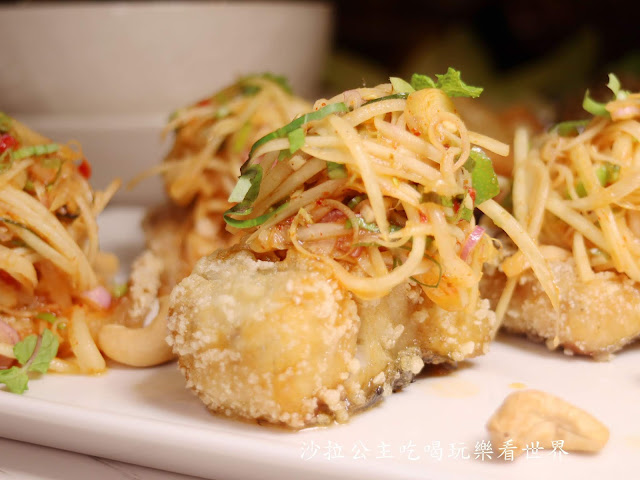 炸得酥脆的鱸魚魚塊,上方是堆得像座小山的青木瓜,吃起來酸甜脆口,魚塊吃起來外酥內細緻,是一道泰國農村家常好菜