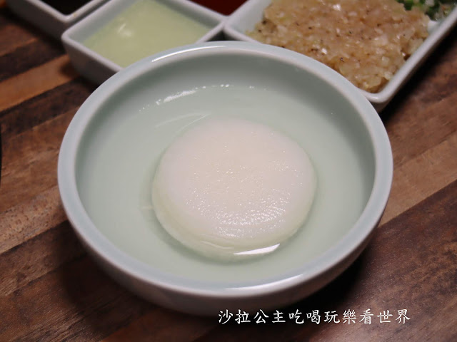源自於京都的經典漬物,取自大根中間最細緻的部份來做千枚漬,每片約1mm,口感清脆甘甜,帶點酸香,可以拿來搭配肉品一起吃,非常清爽