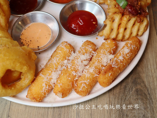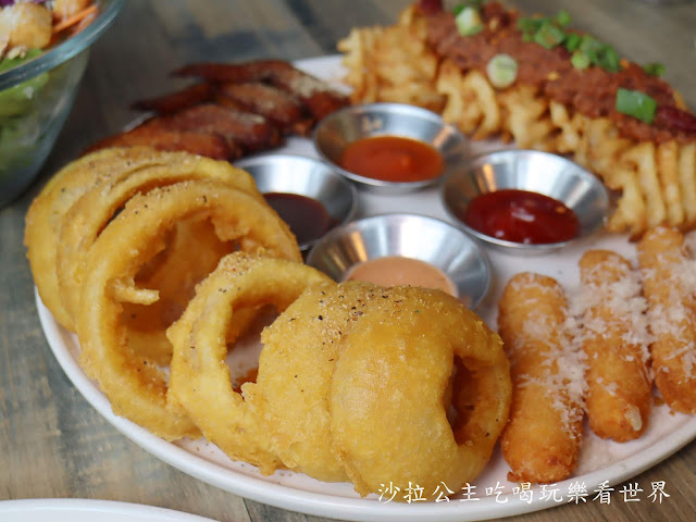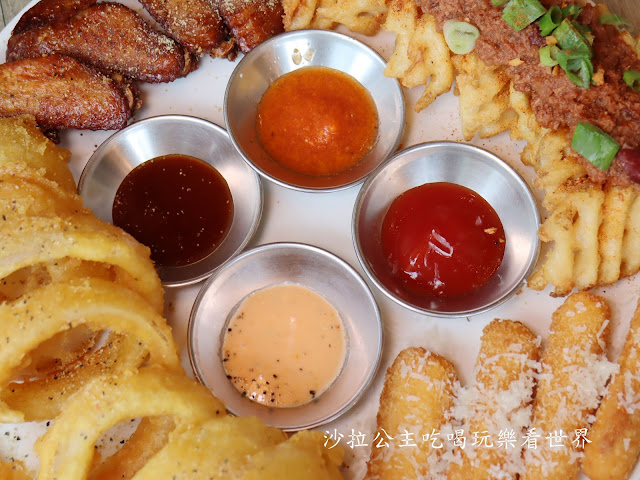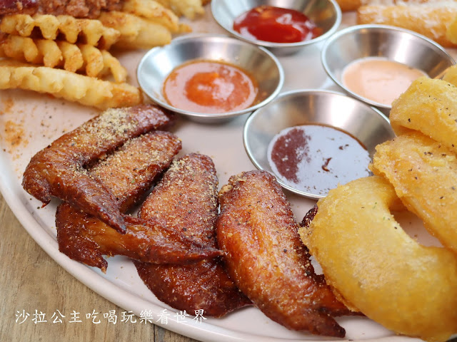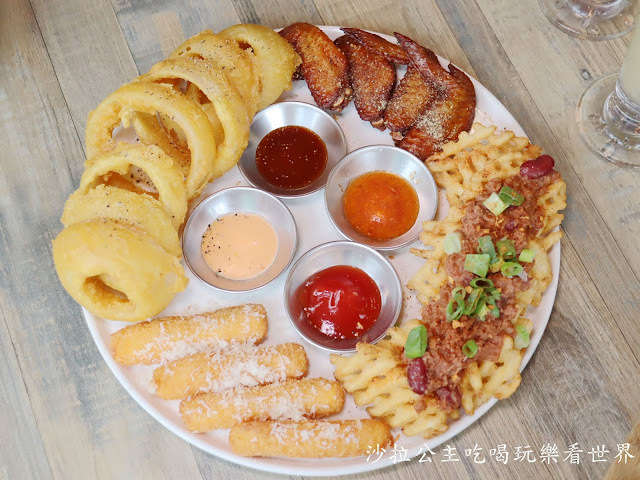 點餐率超高的綜合炸物拼盤(雞翅、洋蔥圈、肉醬鬆餅薯片、起司條)