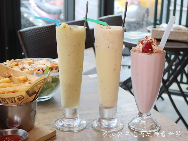左至右:奇異果冰沙、蘋果鳳梨椰奶、草莓奶昔,好大一杯,搭配美式餐點都很清爽