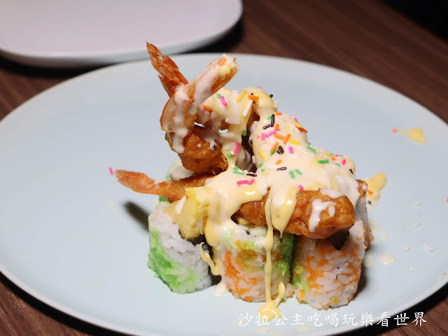 以很受歡迎的台菜"鳳梨蝦球"概念,結合日式炸蝦融合蝦卵、鳳梨芯、小黃瓜、玉子燒等配料,淋上以鳳梨+檸檬汁+煉乳製成的美乃滋,果香及美乃滋的酸甜滋味,吃起來滑順不膩口
