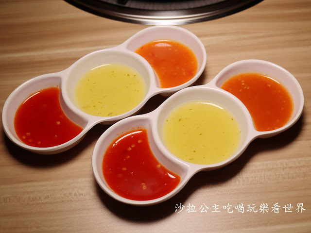 黃色的是青檸醬味道酸甜適合搭配海鮮,兩旁紅色的是泰式辣醬及泰式甜辣醬,泰式甜辣醬還有淡淡的芝麻香