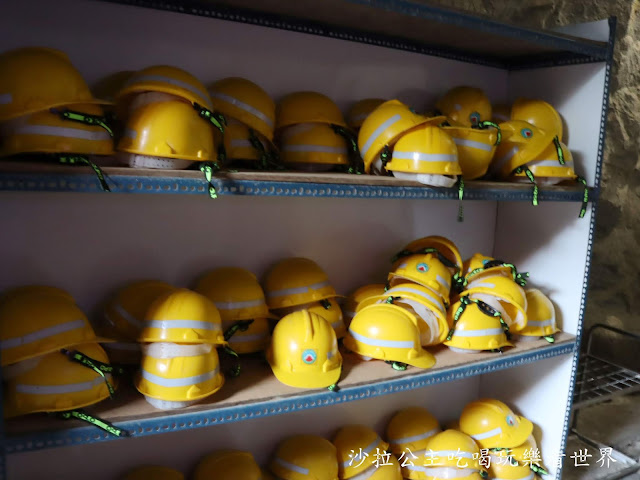 進入坑道前還擺放很多安全帽,有需要的人可以用