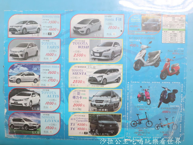 金豐租車的車款有很多,汽車除了5人座之外還有7~9人座,另外有機車、腳踏車租借