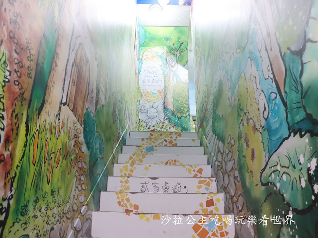 『貳家桌遊』開得很隱密,位在三樓,樓下就跟住宅區的樓梯一樣,2~3樓雙邊牆壁貼的壁貼,覺得好像愛麗絲掉進樹洞,即將展開奇幻旅程