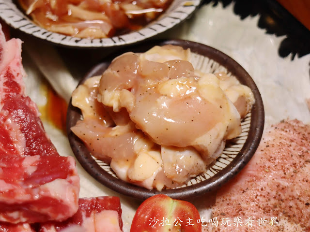 裡面包含:和牛雪花 、和牛橫隔膜、上選牛五花、帶骨牛小排、上選牛肋條、松阪豬、豬五花、醬漬雞腿肉、羅勒雞裸骨