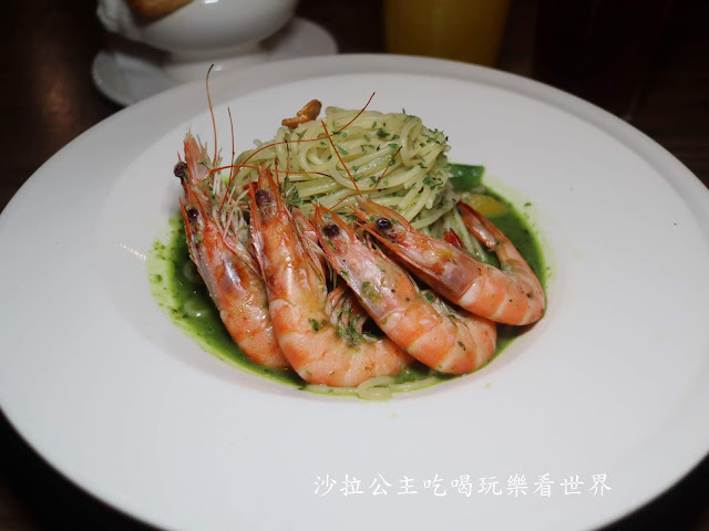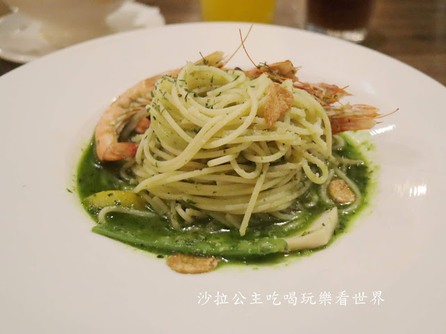 但當天已經賣完了,就改成"蘿勒蒜椒鮮蝦麵"