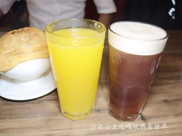 檸檬紅茶我們喝了沒有很習慣,柳橙汁是有果粒的