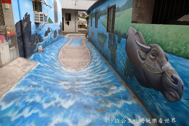 3D藝術牆位在和平街136巷,水牛浸泡在溪中,小船緩緩從旁邊駛過