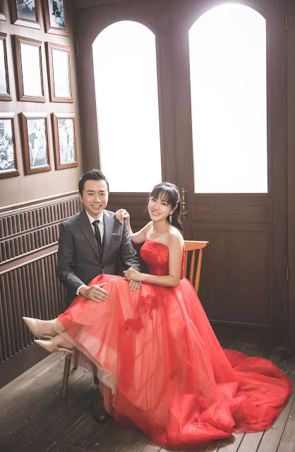 雖然說拍韓風婚紗白紗較能呈現,但我還是有點小小的堅持,就是必須要有紅色,禮服師一開始推薦我穿起來比較大器,剪裁俐落又不失優雅,但我個人覺得我可能撐不太起來大器,所以挑了一旁自己覺得是可愛風的蓬蓬裙,後來看到別人拍的成品,又想要大器的那件,就兩件給我挑都搞不定自己