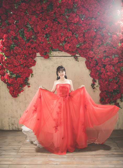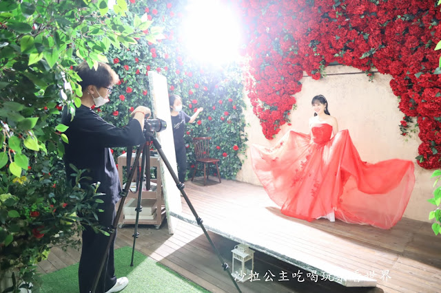 換上我最愛的紅色禮服"平口蕾絲紅紗漸層禮服",在滿滿玫瑰花牆前拍照,散發著午後的熱情