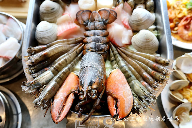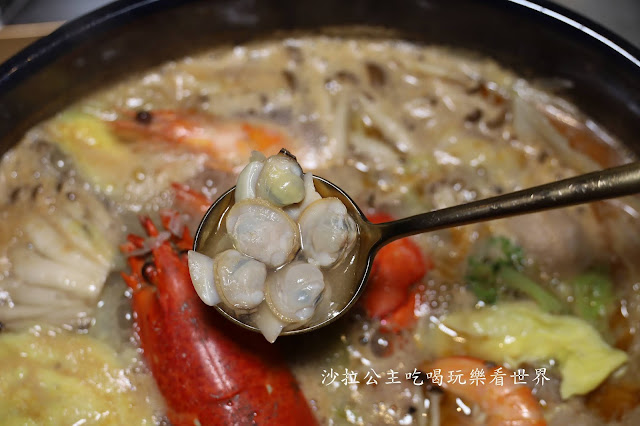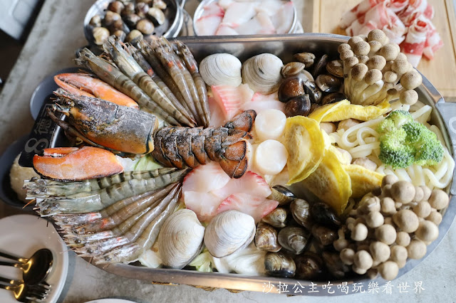 波士頓龍蝦、大草蝦、白蝦、鯛魚、蛤蜊、干貝、牛奶貝、季節時蔬、白飯、烏龍麵,滿滿一大鍋,我覺得我個人是抬不動的