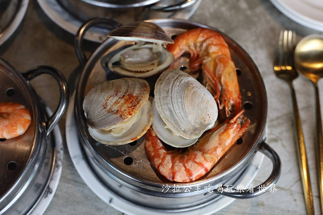 一層層疊起來煮,海鮮的湯汁會留到最底層的火鍋,有服務人員會幫忙計時並在熟時幫你分裝到盤子,方便食用