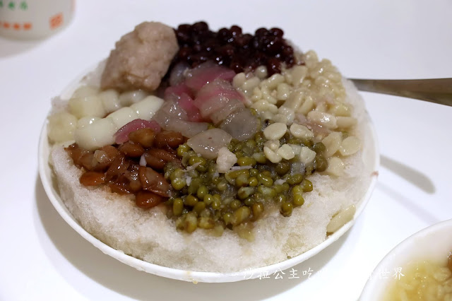 花生、紅豆、大花豆、湯圓、芋圓、綠豆、芋頭,滿滿一大盤