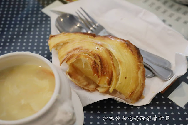 酥皮濃湯上面的酥皮烤的很好,看起來就非常好吃,老闆上餐時跟我說酥皮和湯要分開吃,不要押進湯裡