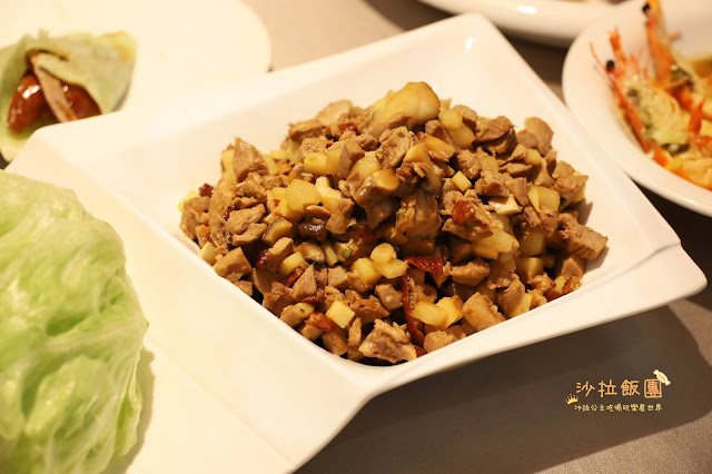 切丁的鴨肉加上杏鮑菇、香菇..等,生菜包著鴨鬆吃,好有層次