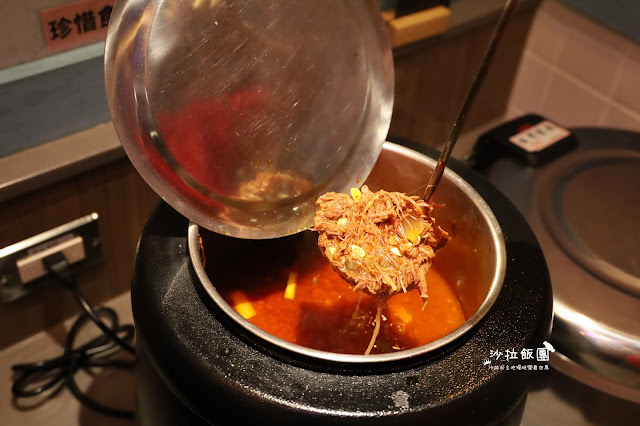 後來看到有人夾完肉直接把盤裡的肉汁倒回去取餐檯裡放肉的盤子我終於明白,因為有醃料,有些人會倒肉汁