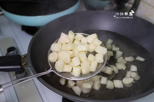 關火候用撈勺把嫩薑撈出,不要帶太多水到容器,容器本身是乾的